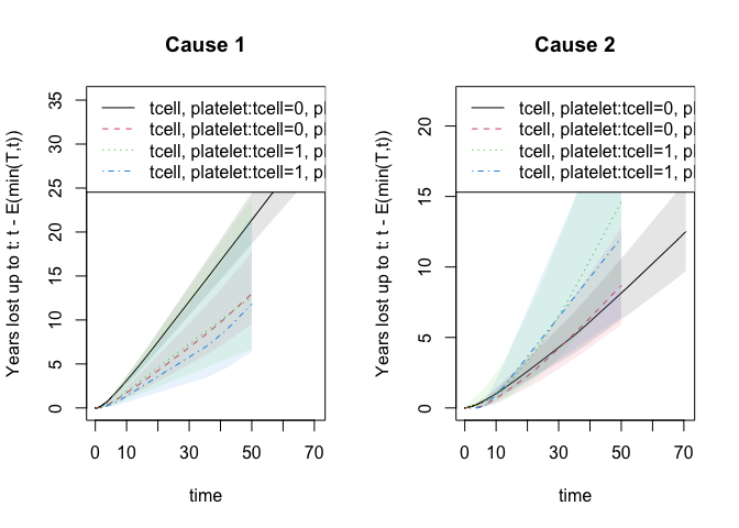 #> [6,] -0.001404170 0.0009471848or the the restricted mean survival or years-lost to cause 1